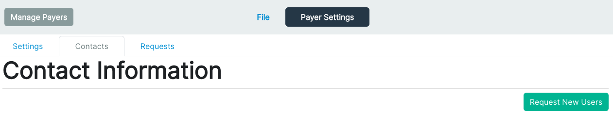 Once you have successfully logged in to add additional contacts to your company navigate to payer settings -> contacts. Click on Request New users as pictured above. You will be greeted with the form below: