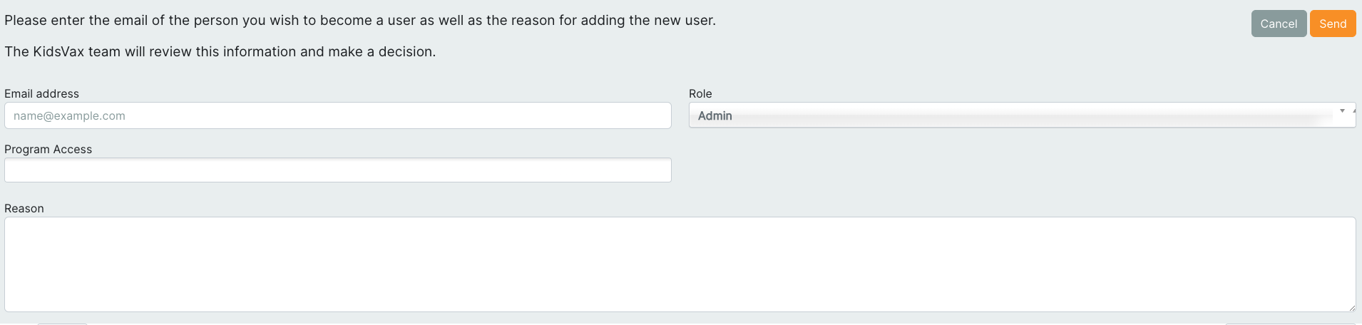 Once you have submitted a request, you will see it populate inside of the requests table. A member of the KidsVax team will review this request and either accept or deny. You will recieve an email regarding your decision, if you are adding a new user, they will recieve an email with a link on how they can sign up.